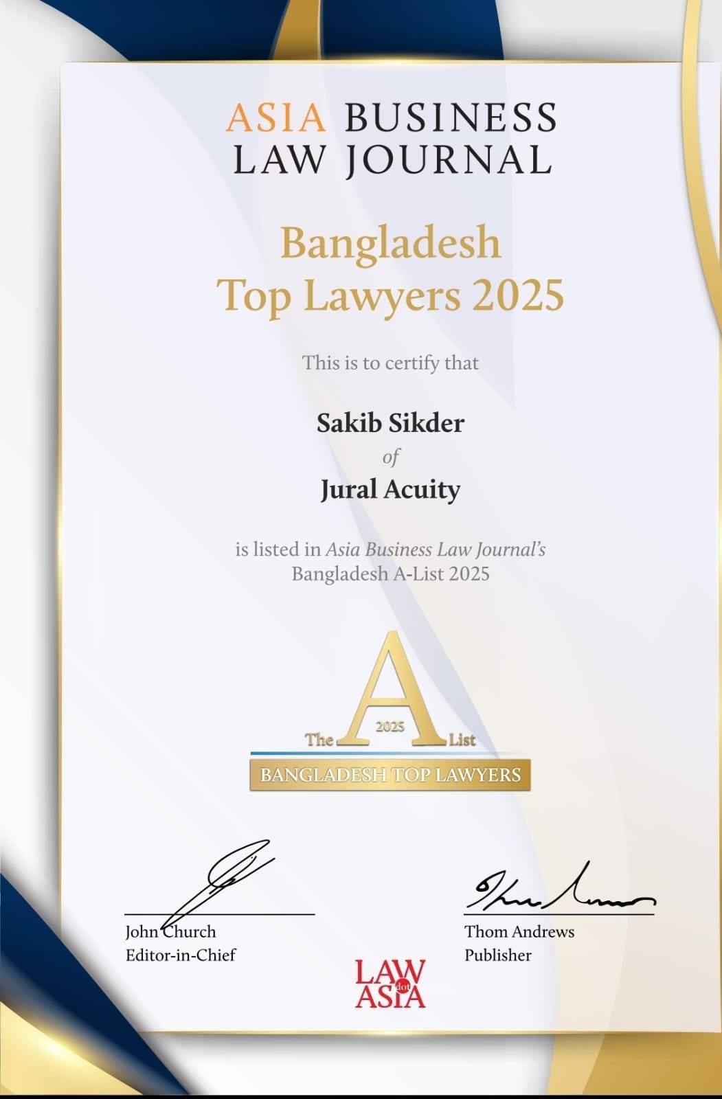 Jural Acuity is recognized as a top law firm in Dhaka, Bangladesh, known for delivering reliable and practical legal solutions. We specialize in corporate, commercial, employment, tax and regulatory law, serving both local businesses and international clients. Our experienced team of lawyers is dedicated to understanding your needs and providing clear, strategic advice to help you achieve your goals. Whether you’re a startup, a multinational company, or an individual seeking legal support, we are here to guide you every step of the way with professionalism and care.Jural Acuity was ranked in the Intellectual Property segment for Legal 500 Asia Pacific for 2025. Jural Acuity’s Partner ASM Sakib Sikder has been listed in Asia Business Law Journal’s Bangladesh A-List 2025